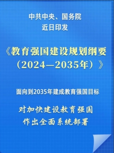 新华社北京1月19日电 近日,中共中央、国务院印发了《教育强国建设规划纲要(2024—2035年)》,并发出通知,要求各地区各部门结合实际认真贯彻落实。