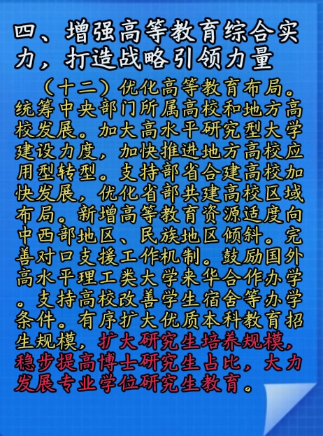 (十二)优化高等教育布局。统筹中央部门所属高校和地方高校发展。加大高水平研究型大学建设力度,加快推进地方高校应用型转型。支持部省合建高校加快发展,优化省部共建高校区域布局。新增高等教育资源适度向中西部地区、民族地区倾斜。完善对口支援工作机制。鼓励国外高水平理工类大学来华合作办学。支持高校改善学生宿舍等办学条件。有序扩大优质本科教育招生规模,扩大研究生培养规模,稳步提高博士研究生占比,大力发展专业学位研究生教育。
