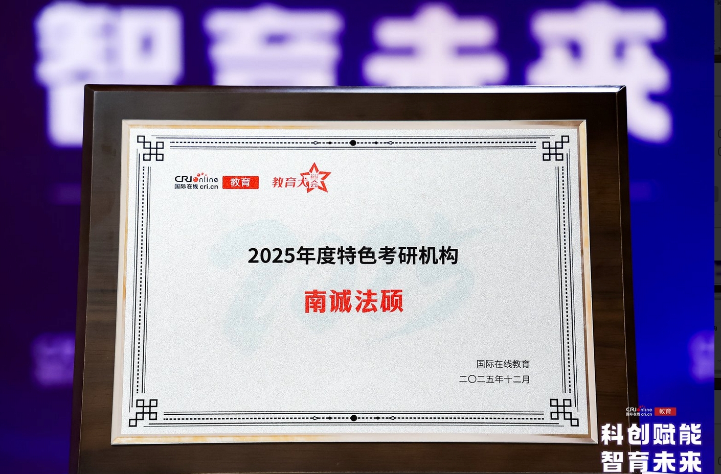 近日,由国际在线教育主办、以 “科创赋能 智育未来” 为主题的 2025 教育大会圆满收官,国内法硕考研赛道的深耕者 —— 南诚法硕凭借在法硕细分领域的专业特色、教学口碑与升学成果,成功摘得 “2025 年度特色考研机构” 荣誉,这一奖项是行业对其专注法硕赛道、打造差异化备考服务的权威肯定。